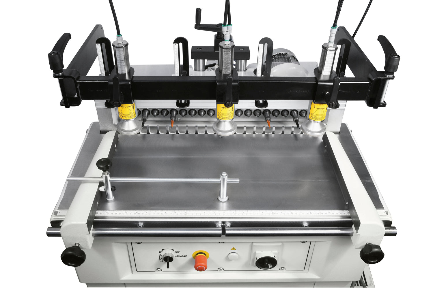 Equipped with quick-release bits and precise spindle spacing for system-based cabinetry and shelf pin drilling. -